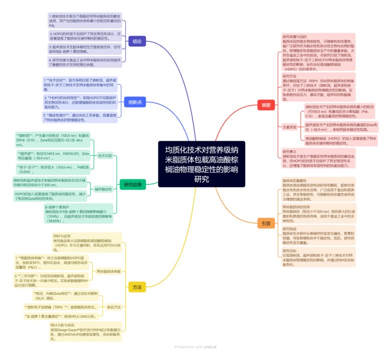 一、介绍本文隶属于微射流均质机应用专题,全文共3800 字,阅读大约需要 20 分钟摘要本研究系统比较了微射流均质、超声波和转子-定子三种制备技术对高油酸棕榈油(HOPO)纳米脂质体物理稳定性的影响。结果表明,微射流均质技术制备的纳米脂质体具有最优的物理稳定性,其平均粒径最小(100.3±1.7 n