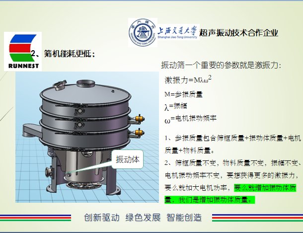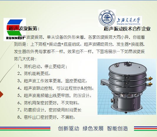 通过精准的模态分析、精确智能匹配、巧妙科学设计以及密闭组合的对接成一套完整的优质筛分设备,在传统直立电机振动力产生的三次元作用力的同时与超声波发生器发射出的振动达到谐振,使得物料在贴合筛网的那一刻精准受到和谐振动力,小于网孔的物料快速通过网孔,粗物料快速实现圆周运行直至从边缘口出料,从而实现了物料在振动筛机上的高效、快速、精准过筛。下图展示下新型超声波筛分设备特点: