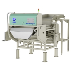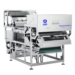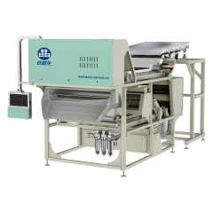 履带传送,物料水平运输,对物料的冲撞小,破损率低,履带传送速度均匀,有利于相机的抓取,提高色选精度。