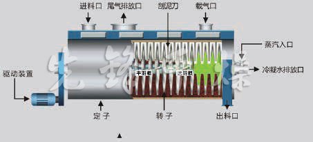 物料由进料口送入干燥机,工作介质在本体外壳和空心轴之间流动,通过C型夹套、空心轴和轴上焊接的空心盘片传递热量,物料被间接加热干化,产生的水蒸气聚集在干燥机的穹顶,由载气带出干燥机。空心盘片与轴基本垂直,通过盘片上的推进/搅拌器的作用,对物料进行搅拌、推进,不断更新干燥面,从而实现干燥的目的。用蒸汽间接加热,通过搅拌物料使水分更快蒸发,进行干燥。