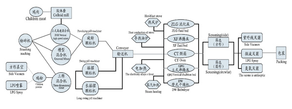 ★ 小型(时产200Kg)鸡精生产线: 设备组成:30B粉碎机、CH-200槽型混合机、ZL-300B旋转制粒机、ZLG-4.5×0.45振动流化床干燥机、FSO.6×1.5方型振动筛等。 特点:产能小而灵活,安装运输方便,设备投资较少,适合于个体用户。为帮助个体用户更快更熟练使用掌握生产线的技术,我公司会对用户进行相关的技术培训,并尽可能提供相关技术支持,甚至包括物料配比方案。