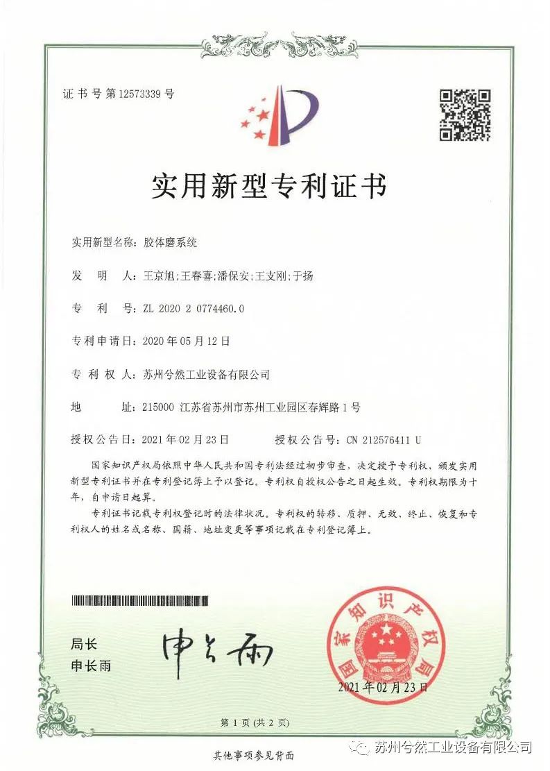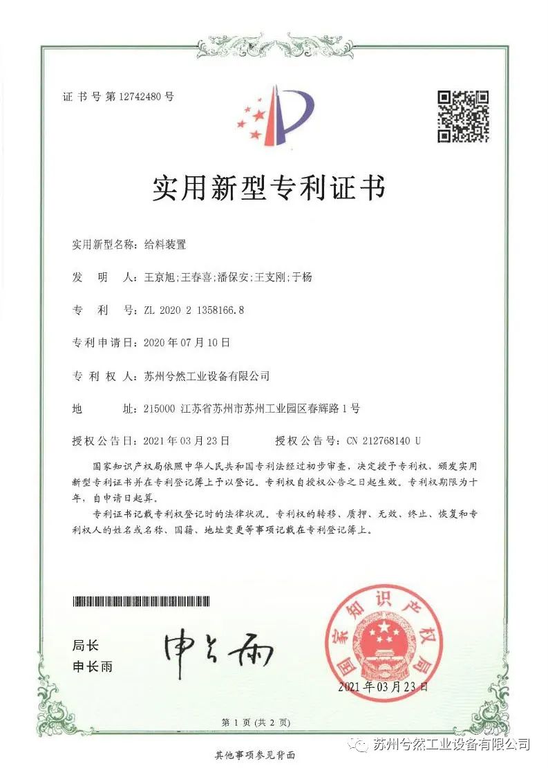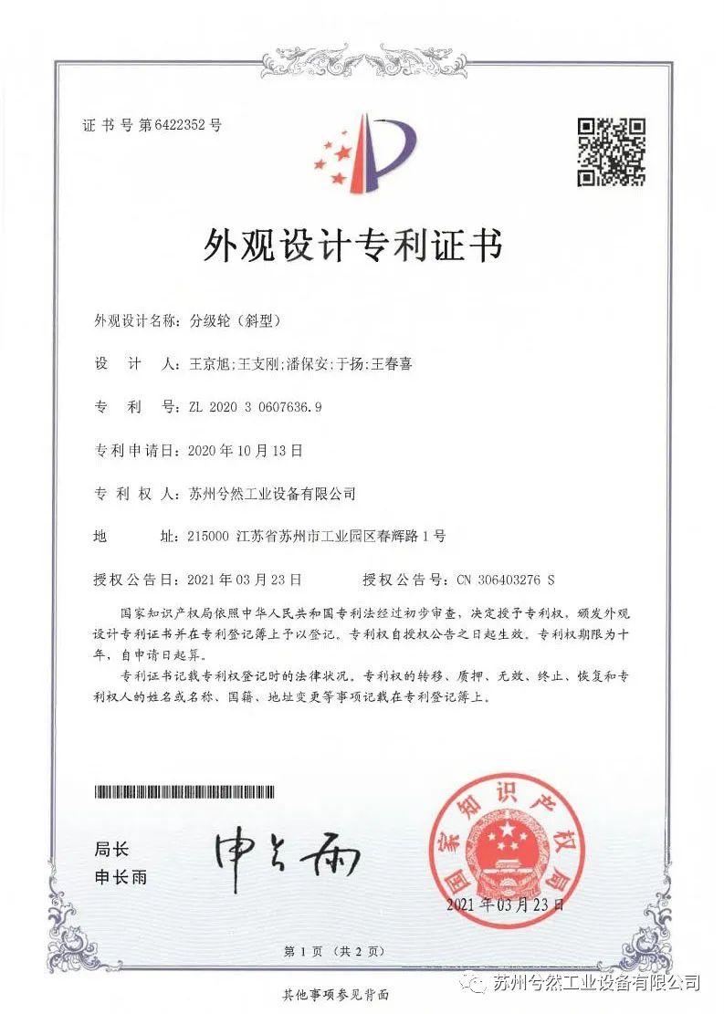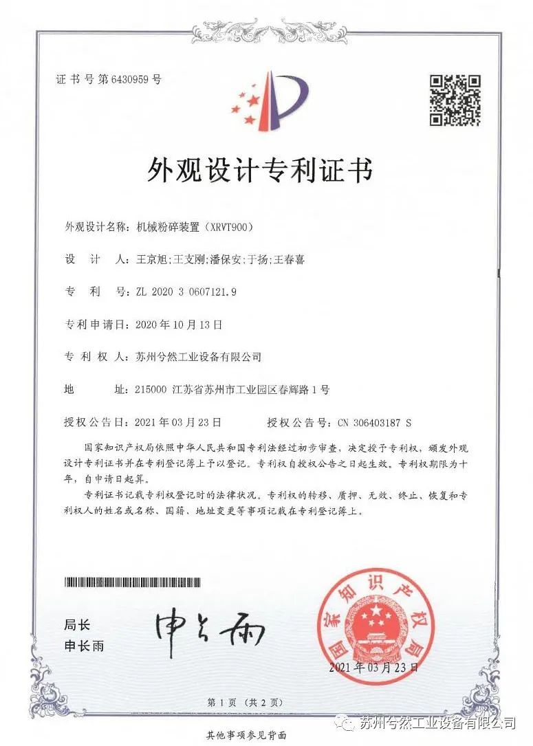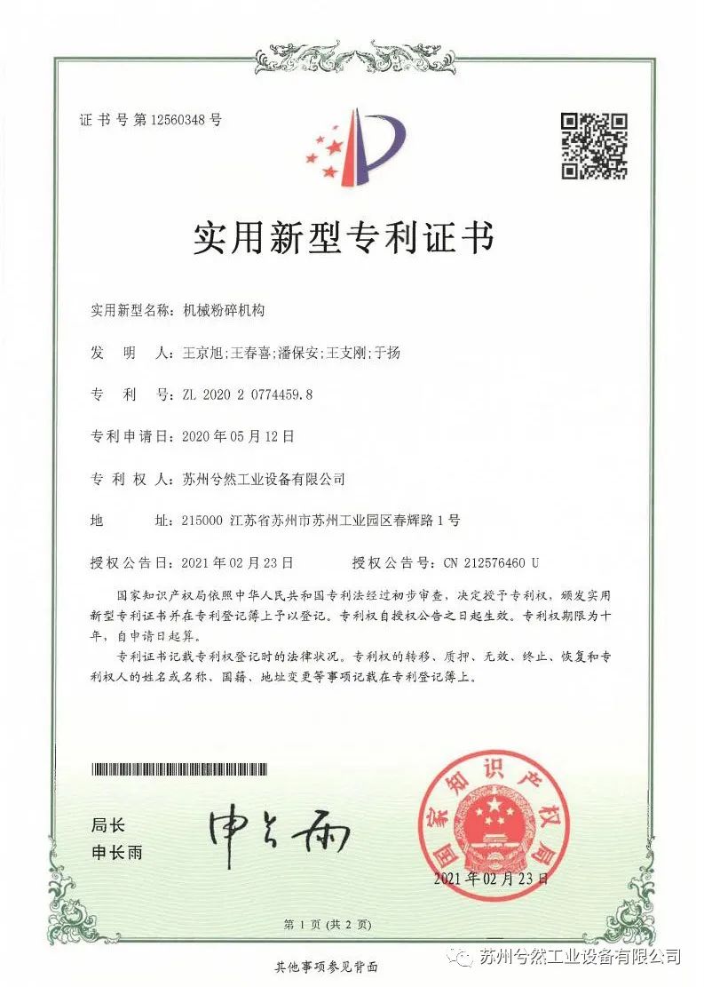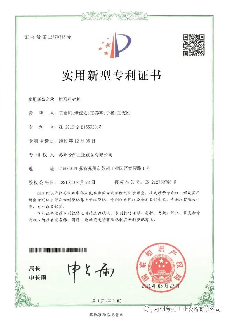 继2020年获得“粉碎机对辊”、“粉碎机主轴气密封装置”和“粉碎机送料装置”三项实用新型专利证书后,近日,苏州兮然工业设备有限公司(以下简称“苏州兮然”)再次喜获“锥形粉碎机”“给料装置”“机械粉碎装置”“分级轮(斜型)”“胶体磨系统”及“机械粉碎机构”六项由国家知识产权局颁发的专利证书。