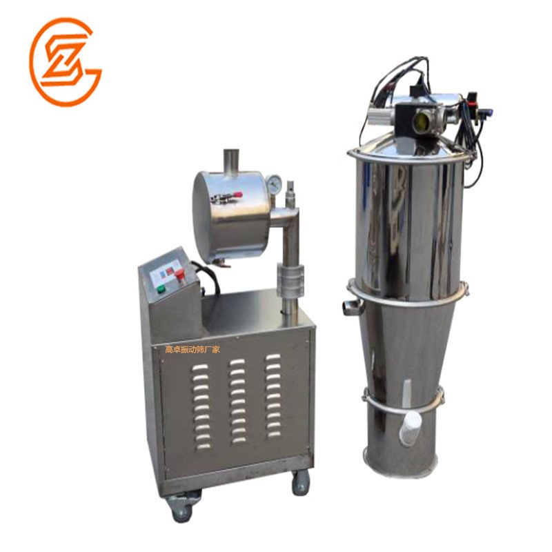 当按下“开/关”按键时,压缩空气进入真空发生器,同时料斗的放料门在气缸推动下关闭,料斗中产生真空。真空加料机在真空下形成一股气流,在这股气流的作用下,被输送的物料经软管输送到真空料斗中,一定时间后(上料时间,可调整)压缩空气被关闭,气动真空泵无法产生真空,同时料斗的放料门在气缸推动下开启,真空加料机真空消失,物料从放料门自动放入受料设备中(如压片机,包装机等)。同时,储存在气包中的压缩空气反吹过滤器,过滤器自动清洗;一定时间后(放料时间,可调节),压缩空气重新启动,气动真空泵产生真空,放料门关闭,真空加料机再次加料,周而复始,物料被源源不断地送入受料设备中。对料位控制的真空加料机,受料设备的料斗中物料通过料位计完成自动加料。当受料设备的料斗高于某一位置时,电动真空上料机停止动作进入待机状态;当料位低于某一位置时,真空加料机自动启动,完成对受料设备的加料。
