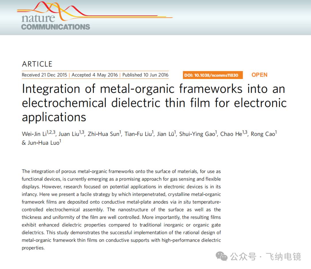 Integration of metal-organic frameworks into an electrochemical dielectric thin film for electronic applications(将金属-有机框架材料集成到电化学介电薄膜中用于电子材料领域)