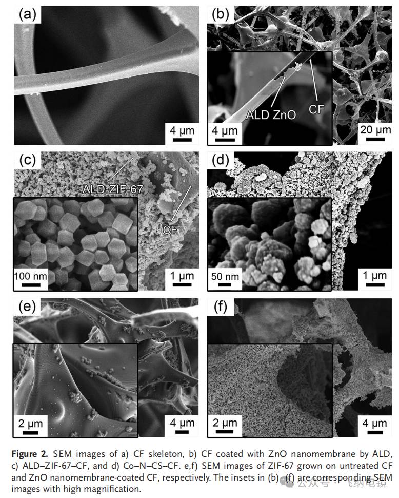 这篇文章的核心内容是通过原子层沉积(ALD)技术在三维碳泡沫(CF)上诱导生长 Zeolitic Imidazolate Framework-67(ZIF-67)层,随后通过热解过程将其转化为 Co, N 共掺杂的碳球(Co–N–CSs),并将其应用于柔性制氢电极。这种复合结构不仅具有高比表面积和多级孔结构,还展现出优异的电化学性能和柔性特性,适用于酸性和碱性电解质中的制氢反应。通过飞纳扫描电子显微镜(Phenom ProX)的表征,研究人员详细观察了从 CF 到 ALD-ZIF-67-CF 再到 Co–N–CS–CF 的形貌变化。这些观察结果为理解 ZIF-67 在 CF 上的生长机制以及热解过程中结构的变化提供了重要支持。这种基于 MOFs 的复合结构不仅在酸性和碱性电解质中展现出优异的电化学性能,还具有显著的柔性特性,为柔性制氢电极的设计提供了新的思路。