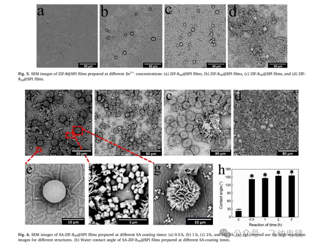 文章受到纳米比亚沙漠中的 Stenocara 甲虫的启发,这种甲虫能够从湿润的空气中收集水分以维持生命。甲虫背部的结构由亲水性突起分布在超疏水背景上,这种结构使得水分子能够在亲水区域凝聚成滴,并在重力作用下滚落。基于这一自然现象,研究人员设计了一种类似的亲水/超疏水图案化表面,用于从雾气中收集水分。研究人员使用了飞纳扫描电子显微镜(Phenom ProX)来观察 ZIF-8 晶体在大豆蛋白(SPI)薄膜表面的生长过程和形貌变化。在低倍率下可以观察到较大的微米级晶体,这些晶体在薄膜表面均匀分布。在高倍率下可以观察到较小的纳米级晶体,这些晶体分布在微米级晶体表面和薄膜表面,形成了层次化的结构。