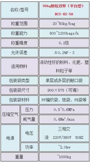 DCS-KS-50型双秤电脑定量颗粒包装秤,是针对颗粒状、流动性较好的物料设计而成的包装机械,它具有称量精度高,操作简单方便、可靠性强、功能完备等特点,可广泛应用于饲料、粮食、冶金、医药、石油化工、非金属矿、精细化工、无机盐、橡塑、皮革、化肥等行业。