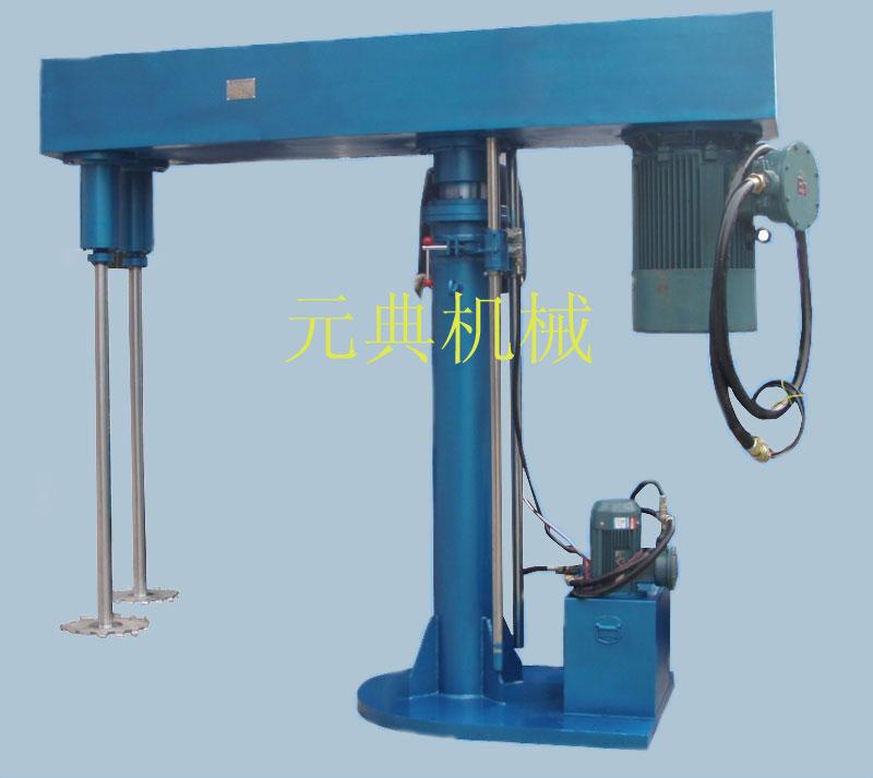 双轴搅拌分散机,适用于各化工行业(如油墨、油漆、涂料、颜料等)的物料分散、混合、调和等生产工艺。能独立分散易分散及对细度要求不高的各种物料,同时进行搅拌混合直接制成产品。本机的分散叶轮为锯齿形,分散叶轮在浆料中作高速旋转运动时,促使缸内浆料剧烈翻动,物料粒子受到强烈的冲击和剪切作用从而迅速地分散成微粒,搅拌浆叶根据物料缸大小而制造,使物料缸四周底部的物料能够得到充分的分散,达到生产工艺要求。