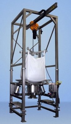 吨袋拆包机是通过叉车或电动葫芦提升料袋至进料口,进行压袋,人工将包装袋下料口拆开后,打开流量控制阀和附带的振动或拍打装置,促使包装袋内的物料通过自重落到下方料斗中。