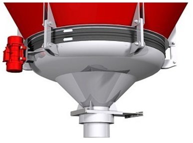 振动给料斗破拱性能好,对于料仓内的各种粉状及粒状物料都能实现破拱和连续均匀排料,可消除不同粒度、不同比重的混合物料在进入料仓时的偏析现象。将振动电机接通电源,振动电机起振,其产生的激振力使给料斗下体在水平方向产生强烈的振动,此振动通过锥面或球面活化器将水平激振力分解为法向力和切向力,法向力呈放射状传递到物料深处,切向力使物料受剪,从而消除仓内物料的起拱,使物料像流水一样从出料口排出。切断电源,振动电机停振,排料可停止。