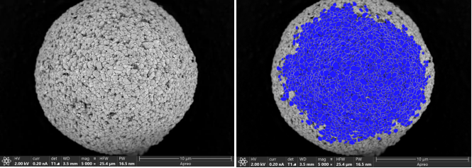 正极颗粒内部通常是二次球颗粒形成的多晶结构,我们将二次球颗粒抛开,发现循环充放电后的颗粒截面出现大量裂痕,如图三。使用LIBMAS对截面孔隙进行识别,快速获得截面孔隙结果。