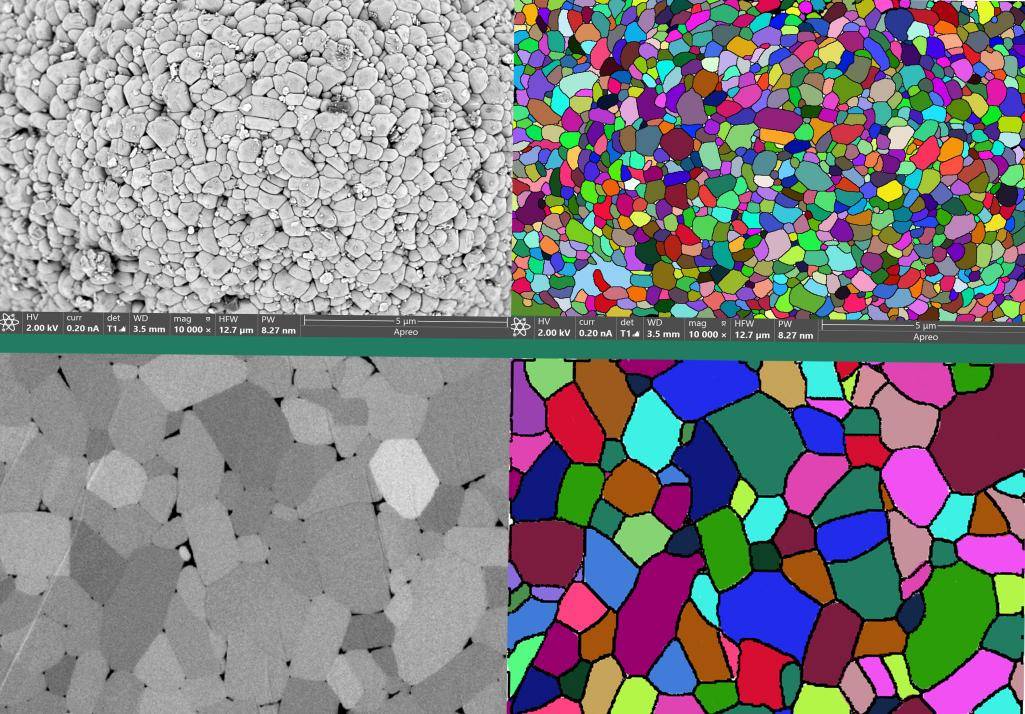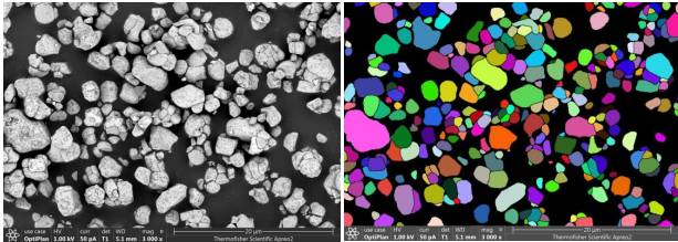 相对于单独的纳米粒子,团聚体颗粒具有比表面积小,颗粒流动性好,压实密度高和电极浆料可加工性好等优点。然而在团聚体反复充放电过程中,电极不断膨胀和收缩,内部颗粒十分容易破碎。相比易产生颗粒粉碎的多晶正极材料,许多研究[4,5]已经开始从晶体结构本身出发,探究单晶三元正极材料的性能,结果表明单晶三元具有更好的机械强度,从而抑制颗粒破碎,在高温循环方面也具有更好的热稳定性。诸如此类的研究都需要准确识别出单晶颗粒及其内部分布情况,汇鸿科技LIBMAS可以自动识别团聚颗粒中轮廓清晰的单晶颗粒,并测量、统计其直径,如图六。