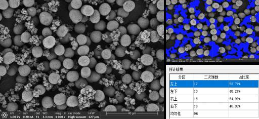 正极三元颗粒通常需要在高温纯氧下进行烧结,烧结而成的三元产品一般具有典型的团聚体形貌,即由粒径约几百纳米的一次粒子组成的,在几个到十几个微米之间的二次球颗粒。以往采用人工统计分析,需要在SEM成像后,手动逐个测量,工作量大,而且存在人为测量的误差;采用汇鸿智能分析软件,则可以一键操作,简化流程,在短时间内快速获得标准化的统计结果,如图四。
