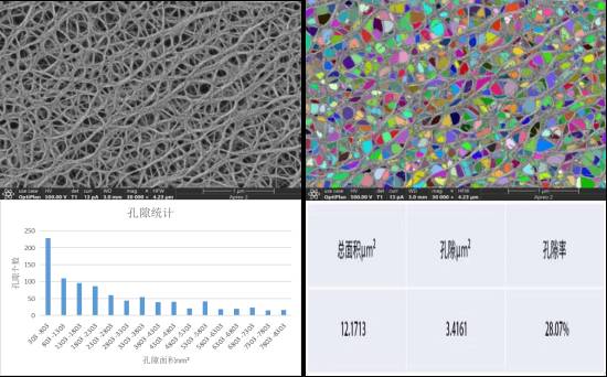 汇鸿LIBMAS可以快速获取隔膜的孔隙率信息,检测隔膜孔隙率、孔隙直径及纤维直径并统计分析,从而形象地描述隔膜表面的结构细节,提高锂电池隔膜孔隙率评定的准确性,如图九。