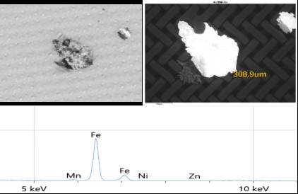 图一:同一颗粒分别在光学显微镜(左)、电子显微镜(右)下的图像及EDS能谱识别颗粒主要成分为Fe