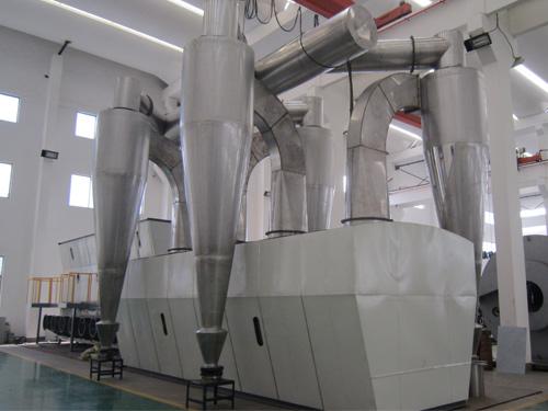 沸腾干燥器,又称流化床,它是由空气过滤器、加热器、沸腾床主机、加料器、旋风分离器、布袋除尘器、高压离心风机、操作台等组成。由于干燥物料的性质不同,配套除尘设备时,可按需要考虑,可同时选择旋风分离器、布袋除尘器,也可选择其中一种,一般来说比重较大的如冲剂及颗粒物料干燥只需选择旋风分离器,比重较轻的小颗粒状和粉状物料需配套布袋除尘器,并备有气力送料装置供选择。