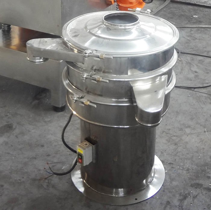 本机由料斗、振荡室、联轴器、电机组成。振荡室内有偏心轮、橡胶软件、主轴、轴承等组成。可调节的偏心重锤经马达驱动传达到主轴中心线,在不平衡状态下,产生离心力,使物料强度改变在筛内形成轨道旋涡。重锤调节器的振幅大小可根据不同物料和筛网进行调节。