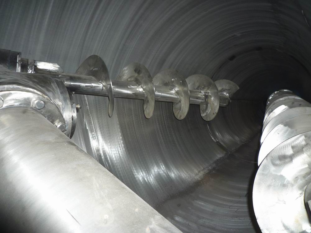 3、螺旋公转与自转相互配合,将物料受螺旋旋转吸收,同时向圆周方向排散。