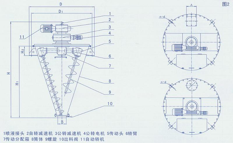 双螺旋锥形混合机凭借内部悬臂上的两根非对称螺旋在绕自身轴线上自转的同时,由悬臂驱动,绕筒体中心轴旋转形成公转。