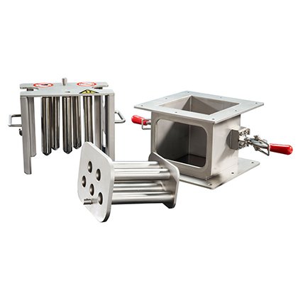 抽屉式除铁器采用单层抽屉或多层抽屉式磁棒交叉排布的方式, 可以有效去除自由下落的粉末或颗粒料中混有的细小杂铁(**到13mm)。 抽屉式除铁器还可制作成带套管的半自动除铁器,通过将除铁磁棒与套管的人工分离达到快速卸铁的目的,但同时需要停止生产线。