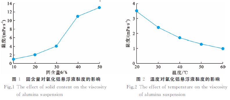 (1)随着固含量的增加,氧化铝悬浮液黏度不断增大;随着温度的上升,氧化铝悬浮液黏度逐渐降低;pH 值对氧化铝悬浮液黏度影响不大.