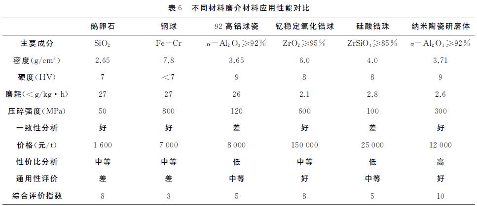 纳米陶瓷研磨体在研磨行业中的地位和作用在现有的磨介材料中,除越来越少的天然鹅卵石外,其他都是人造材料。如,钢球、氧化铝球、氧化锆球、硅酸锆珠、硅珠(玻璃珠)等,其应用性能列表对比见表6。判断磨介在实际应用中的优劣最主要的是其适用性和经济指标。从表6可知,纳米陶瓷研磨体是综合性能最佳的品种,在市场中其应用潜力最大。