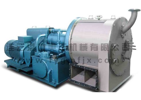 HR型卧式双级活塞推料离心机是通过主电机带动套装的内、外转鼓全速旋转,物料由进料管连续引入,均匀分布到内转鼓内段滤网壁上,在离心力作用下,液相物穿过滤网和转鼓壁滤孔排出,经排液管排出机外,固相物截留在内转鼓形成环形滤饼层。内、外转鼓同速旋转的同时,在活塞推动下,内转鼓连续轴向往复运动,因而推料盘推动内转鼓滤饼层间歇不断地向外移动排出内转鼓,进入外转鼓进一步分离并形成环形滤饼层,内转鼓外端面则推动外转鼓滤饼层间歇不断地向外移动排出外转鼓,经刮料槽排出机外。