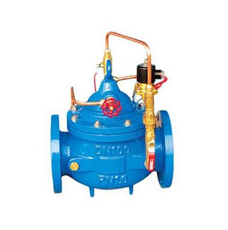 700X水泵控制阀由主阀4、针阀2、电磁向导阀7、单向阀6、球阀3、电器控制。压力等级:PN10、PN16、PN25 隔膜式:DN20-450,生产的700X水泵控制阀能够控制水泵的止回阀,当水泵停止运行前,由进口压力先关闭主阀的90%时,使水泵自动鼎峙,剩下的10%由回水关闭,可完全防止水锤现象产生,该适用于工矿企业、高层建筑中由水泵直接供水及生活用水管网系统。