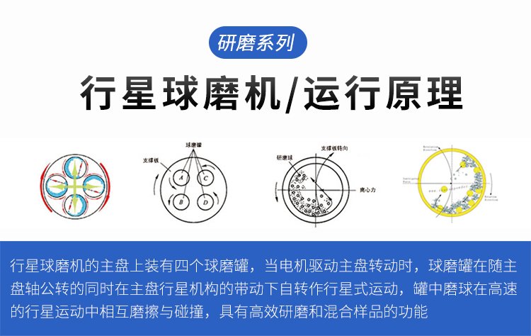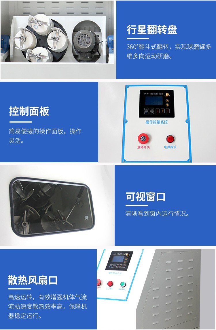 全方位行星球磨机是在立式行星球磨机基础上,增加了行星盘翻转功能,行星盘和球磨罐在做行星运动的同时,又可在一立体空间范围内做360°翻斗式翻转,实现球磨罐多维多向运动,提升磨球及物料无序化运动程度,整个物料在磨罐内无死角研磨,使所研磨的物料更加匀细,并能解决部份物料沉底和粘罐问题。