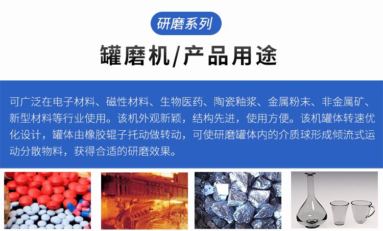 罐磨球磨机也叫滚坛机,是实验室、小批量生产用超细研磨、混合设备。该机美观新颖,结构紧凑,操作方便,工作效率高,磨细粒度均匀,是科研、教学、试验、生产的优选设备。可广泛在电子材料、磁性材料、生物医药、陶瓷釉浆、金属粉末、非金属矿、新型材料等行业使用。该机外观新颖,结构先进,使用方便。该机罐体转速优化设计,罐体由橡胶辊子托动做**转动,可使研磨罐体内的介质球形成倾流式运动分散物料,获得**的研磨效果。 罐磨机(滚坛机)机采用了数显时间控制器控制,根据需要可以随时设定工作时间,并具有暂停、累加定时控制功能,操作省时省力,轻松方便。