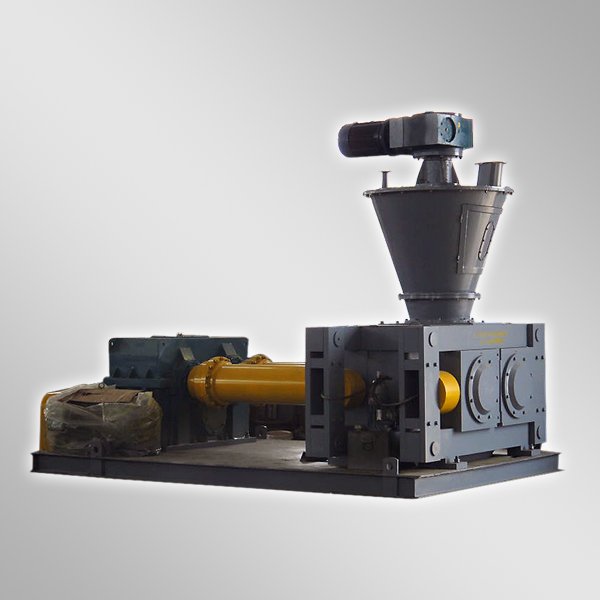 原料经定量加料器均匀送入喂料斗, 压实机利用带有穴眼孔的成对轧辊,彼此留有一定间隙,两者以相同的转速作反向旋转。其中一组轧辊轴承座在机架内不动,而另一组轧辊轴承座则在机架导轨上游动,藉助液压缸施压使彼此紧靠。轧辊表面上有规则地排列许多形状、大小相同的穴眼孔,且波谷对准波谷。而此时干粉状物料从两轧辊上方连续均匀地靠自重及强制喂料进入两轧辊之间,物料先作自由流动,进入咬入区后被轧辊逐渐咬入波谷。随着轧辊的连续旋转,物料占有的空间逐渐减少而被逐步压缩,并达到成型压力**值。随后则压力逐渐降低,所压得之型块因弹性回复加之自重而脱落穴眼孔而进入碎整粒、筛分装置,所得成品为粒状合格产品,进行过秤包装。而粉料口出来的细粉料和不合格的超大颗粒则由返料绞龙重新进入提升机加料口随同新鲜物料混合加入预加料斗而进入下一轮工艺流程。