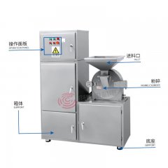 不锈钢无尘粉碎机主要用于化工、医药、食品、香料、树脂、粉体、涂粉等弱电性物质及耐高温物 质。利用活动齿盘和固动齿盘间的相对运动,使物料经齿盘冲击、摩擦及物料彼此间冲击而获得粉碎。 粉碎好的物料经旋转离心机的作用,自动进入捕集袋,粉尘由吸尘箱经布袋过滤回收。该机按“GMP” 标准设计,全部用不锈钢材料制造,生产过程中无粉尘飞扬。且能提高物料的利用率,降低企业成本。 该粉碎机已广泛应用于制药、化工、食品、塑料等工业,是物 料中细度粉碎的理想设备。
