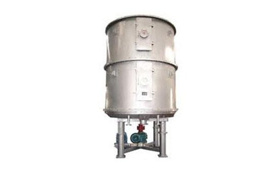 湿物料自加料器连续地加到干燥机上部**层干燥盘上,带有耙叶的耙臂作回转运动使耙臂作回转运动使耙叶连续地翻抄物料。物料沿指数螺旋线流过干燥盘表面,在小干燥盘上的物料被移送到外缘,并在外缘落到下方的大干燥盘外缘,在大干盘上物料向里移动并从中间落料口落如下一层小干燥盘中。大小干燥盘上下交替排列,物料得以连续地流过整个干燥器。中空的干燥盘内通入加热介质,加热介质形式有饱和蒸汽、热水、导热油和高温熔盐,加热介质由干燥盘的一端进入,从另一端导出。已干物料从*后一层干燥盘落到壳体的底层,*后被耙叶移送到出料口排出。湿份从物料中溢出,由设在顶盖上的排湿口排出,真空型盘式干燥器的湿气由设在顶盖上的真空泵口排出。从底层排出的干物料可直接包装。通过配加翅片加热器、溶剂回收冷凝器、袋式除尘器、干料返混机构、引风机等辅机,可提高其干燥的生产能力,干燥膏糊状和热敏性物料,可方便地回收溶剂,并能进行热解和反应操作。