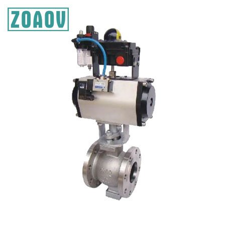 V型球闽采用金属硬密封结构,V型闽芯及金属闽座在回转过程中,球芯的V型缺口与阀座做比例流量调节,并且密封面紧密配合,V型口具有强大切断介质、杂质的功能,避免阀门卡死现象发生,并具有自洁功能,配合气动执行器,可以实现90°范围的启闭,跟定位器配套实用可实现远程微电脑控制阀门流量开度,可实现比例调节:与二位五通电磁及控制箱配套实用,可实现开关控制。