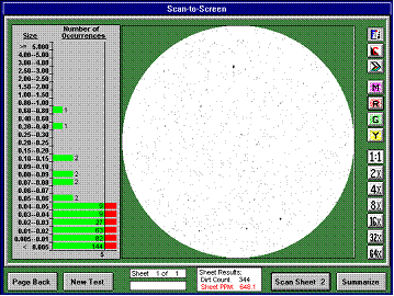 Spec*Scan 能提供广泛的样品数据,包括可定义面积柱状图,灰度统计,斑点图象和尺寸,样品摘要和列表清单。