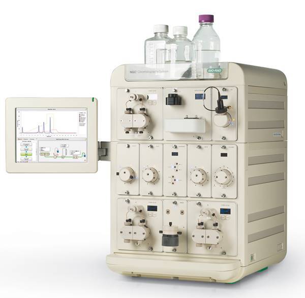 NGC 下一代中高压层析系统是一系列自动化的液相层析系统,主要用于生物分子的分离纯化,可满足科研、工艺开发以及从小规模到中试级制备等不同的应用要求。NGC 层析系统的核心是一个真正的模块化平台,具有近乎无限的拓展潜力,其直观的操作软件使系统控制和结果分析变得极其简单。因此,Bio-Rad 的 NGC 层析系统能够为您分离纯化生物分子提供一个可靠的解决方案。一个出色的层析解决方案,不仅能支持您当前的实验需求,还能通过功能拓展满足你未来对通量的特殊需要。NGC 系统能够根据客户的需要进行选择,对于不同客户的不同要求,NGC 系统还能通过额外添加模块组件和层架来实现。NGC 系列层析系统可选择 10 ml/min( 压力范围 0-3650 psi )或 100 ml/min( 压力范围 0-1450 psi )两种系统泵;缓冲液自动配制阀系统不仅可在线自动配制缓冲液,还可倍增系统流速到 20 ml/min( F10 泵系统 )和 200 ml/min( F100泵系统 ),多种体积混合池的选择以适应不同的流速范围;含自动进样阀,紫外检测器可选单波长检测器( 提供 280/255nm 检测 )和全波长检测器( 波长范围 190-800 nm,4 波长同步检测 ); ChromLabTM 软件,标配触摸屏以方便进行在位控制。可选各种溶液/样品选择阀、柱位切换阀、缓冲液自动配制阀系统、和出液阀等用于定制各种层析过程的通量和自动化的需求。可选 BioFrac 方形收集器可用于高通量和大规模收集。