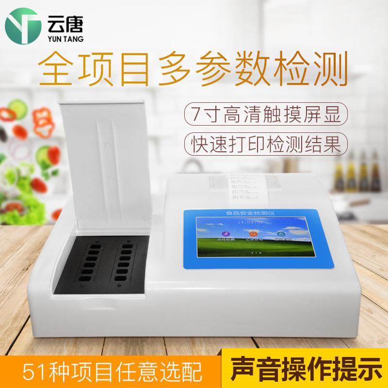 1、检测项目:可快速检测各类食品中的甲醛、吊白块、二氧化硫、亚硝酸盐、双氧水、硼砂、农药残留、乳及乳制品中蛋白质、硝酸盐、重金属铅的含量,仪器预留其他项目检测程序和端口,根据日后需求可方便的自主增加检测项目。