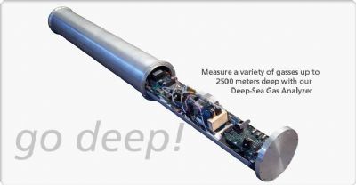 深海气体分析仪提供了深达2500米的海水内多种气体浓度的准确测量功能。仪器采用了膜式气体分离器,可以测量诸如甲烷、二氧化碳、碳同位素、氧气、水同位素等气体浓度。通过使用内置电池、气体操作系统和数据存储器等设置,仪器实现了自记录的遥控操作。主要的应用包括海洋水体的碳扣留(carbon sequestration)、甲烷水合研究与水热排放效应分析等研究。