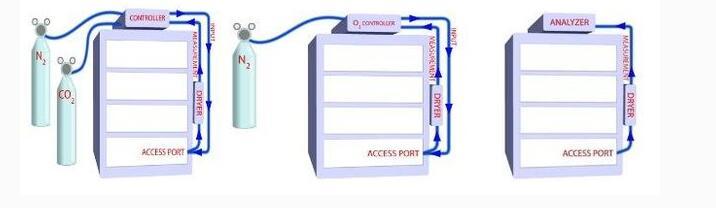 Controllers add 100% CO2 and 100% N2 to the volume in which gas control is desired.