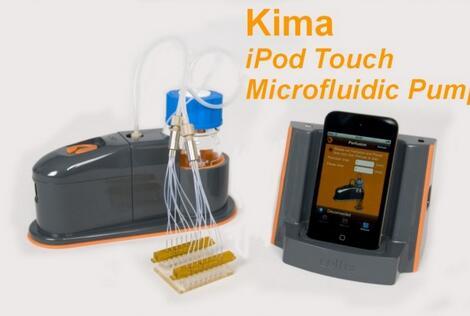 The KimaTM Pump is a microfluidic pump designed to aid cell culture (e.g. endothelial cells) under physiological conditions (shear flow) in various biochips and flow chambers, including Cellix's Vena8 Endothelial+ biochips where it is possible to culture 8 cell monolayers simultaneously over 24-48 hours. The KimaTM pump is controlled by the iKimaTM Application for use with the iPod Touch and iPhone. The iPod Touch is included with the sale of the Kima pump. The KimaTM pump is placed inside a standard incubator while the iPod Touch or iPhone, as it's controller, sits on the Universal dock outside the incubator. The KimaTM pump connects easily to Cellix's Vena8 Endothelial+ biochip and other manufacturer's flow chambers via fully autoclaveable tubing and delivers pulses of fresh media to cells seeded inside the microchannels.