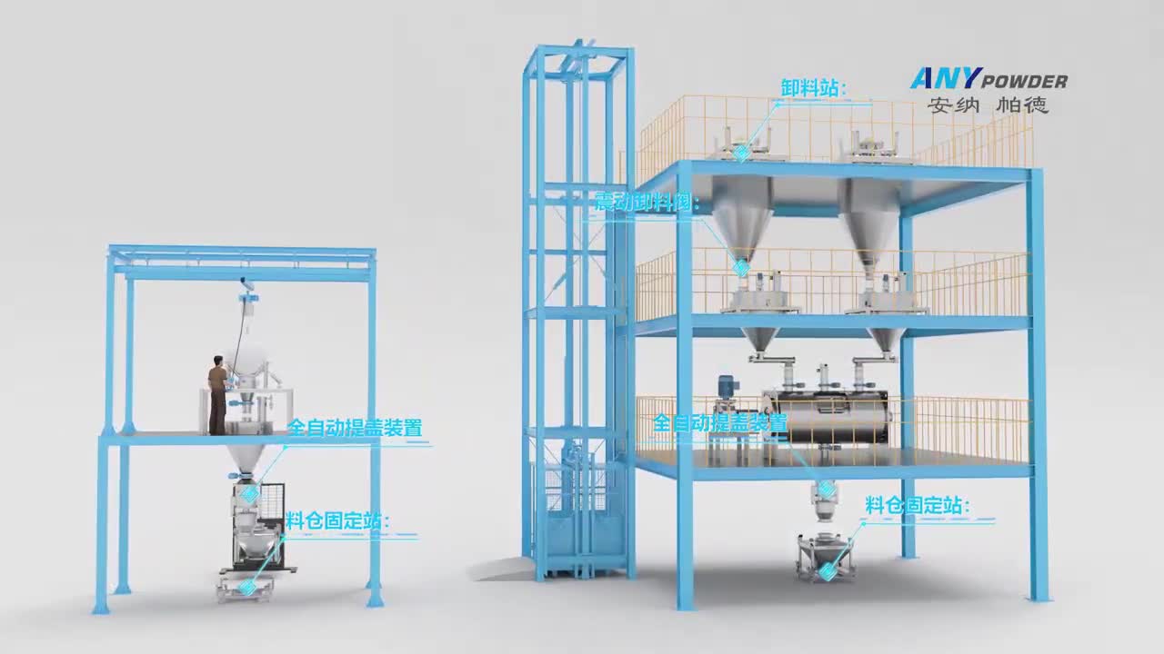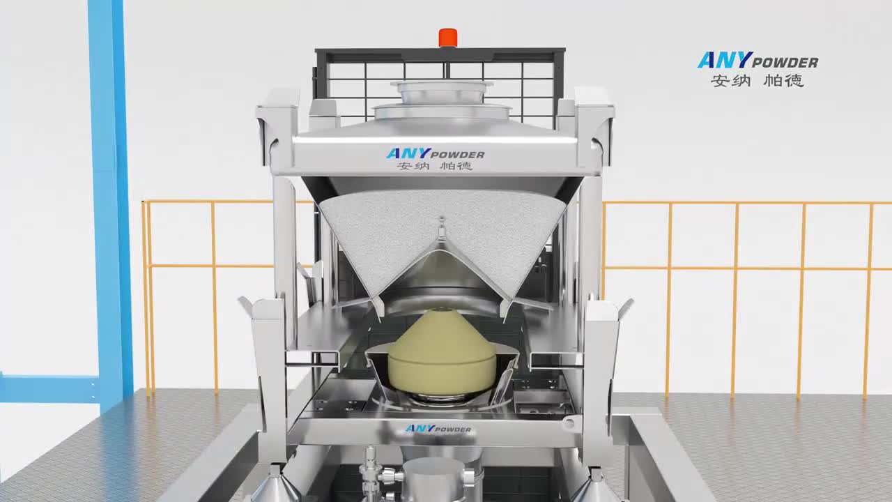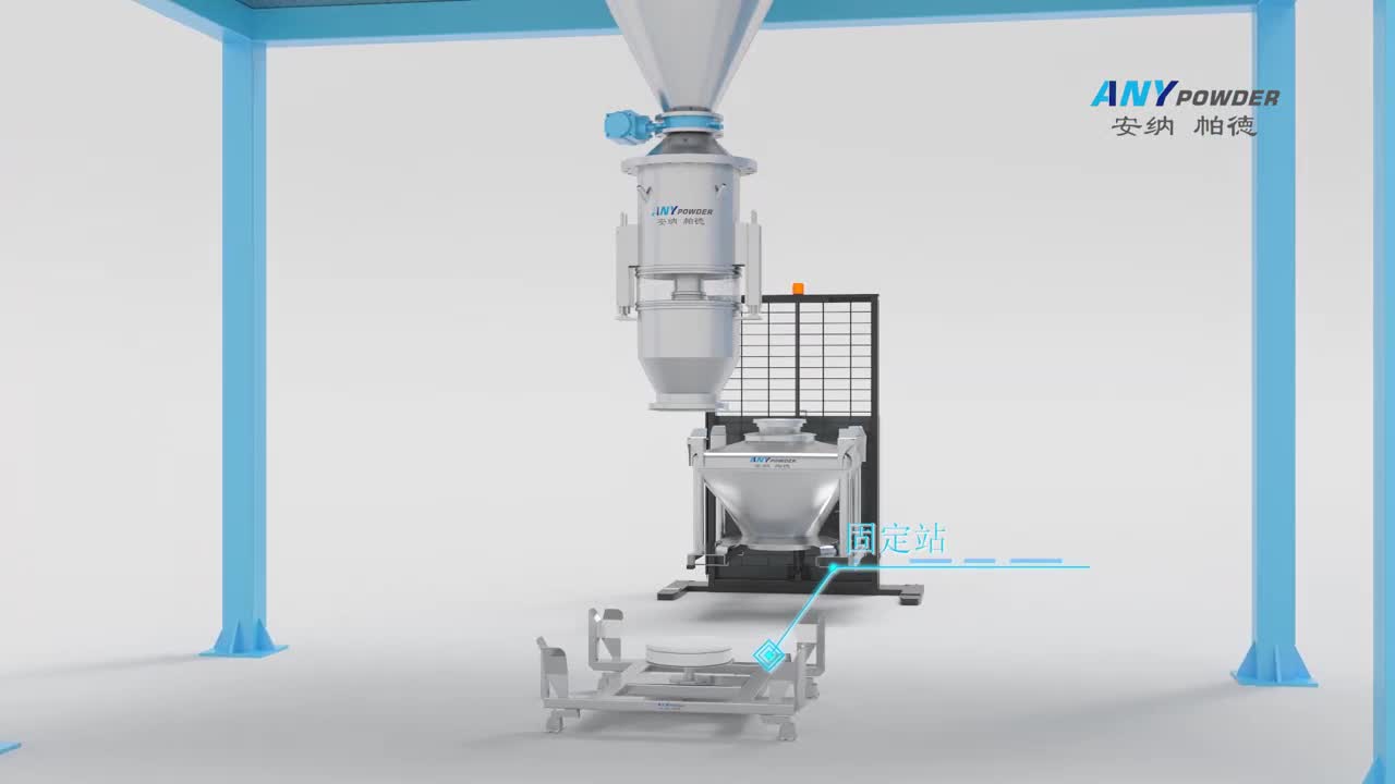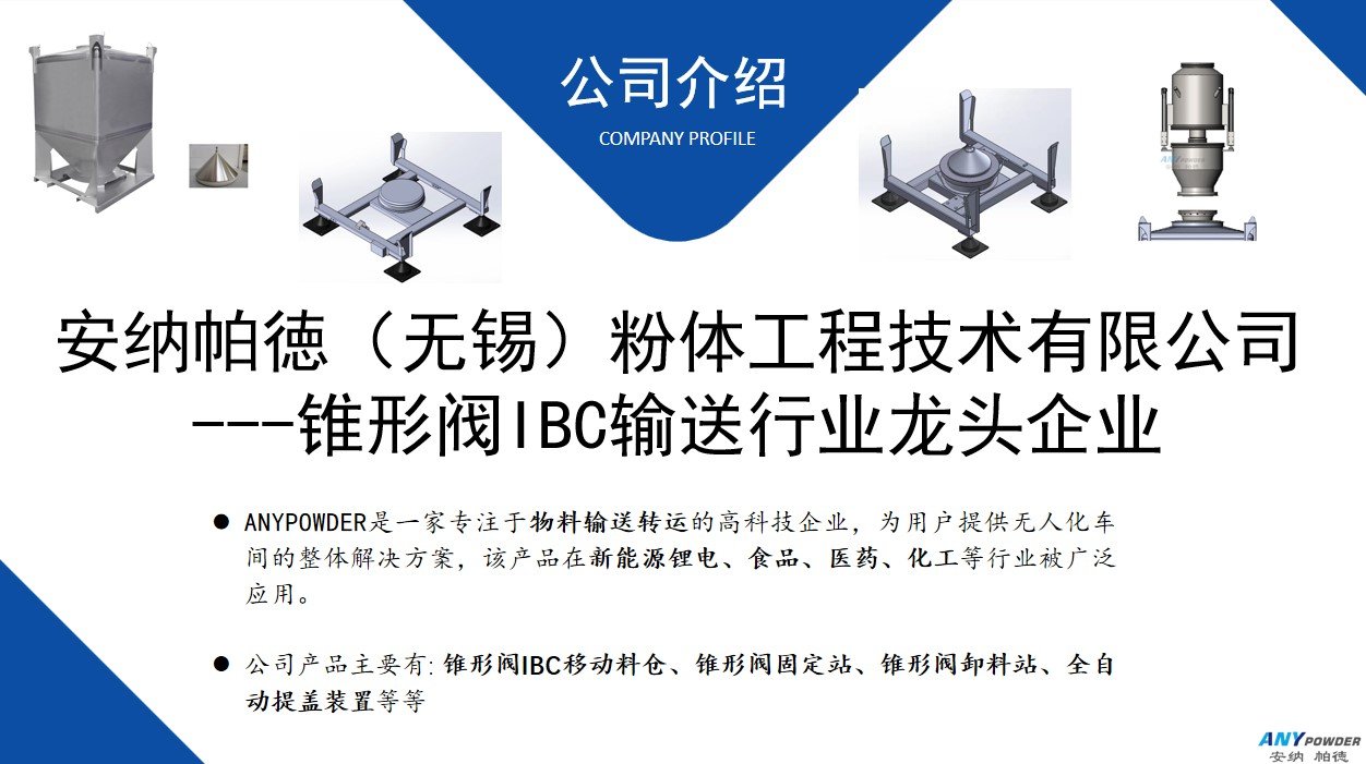 ANYPOWDER是一家专注于物料输送转运的高科技企业,为用户提供无人化车间的整体解决方案,该产品在新能源锂电、食品、医药、化工等行业被广泛应用。公司产品主要有:IBC移动料仓(锥形阀)、固定站(锥形阀)、卸料站(锥形阀)、全自动提盖装置等等。1、 固定站(锥形阀):用于接料工位;该固定站具有校正料罐内锥阀位置;可实现自动称量,无尘接料;用于压实物料,可配置震动功能;配合AGV(自动导航小车)实现工厂自动化,连接DCS工厂监控系统进行实时监控。2、 全自动提盖装置:用于取盖工位;无需人工取盖,完全自动化;可实现无尘填料;可配带喷吹吸功能,自动清理密封盖外表面的粉尘和异物。3、 卸料站(锥形阀)