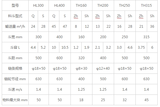 环链斗式提升机HL型与TH型技术参数表: