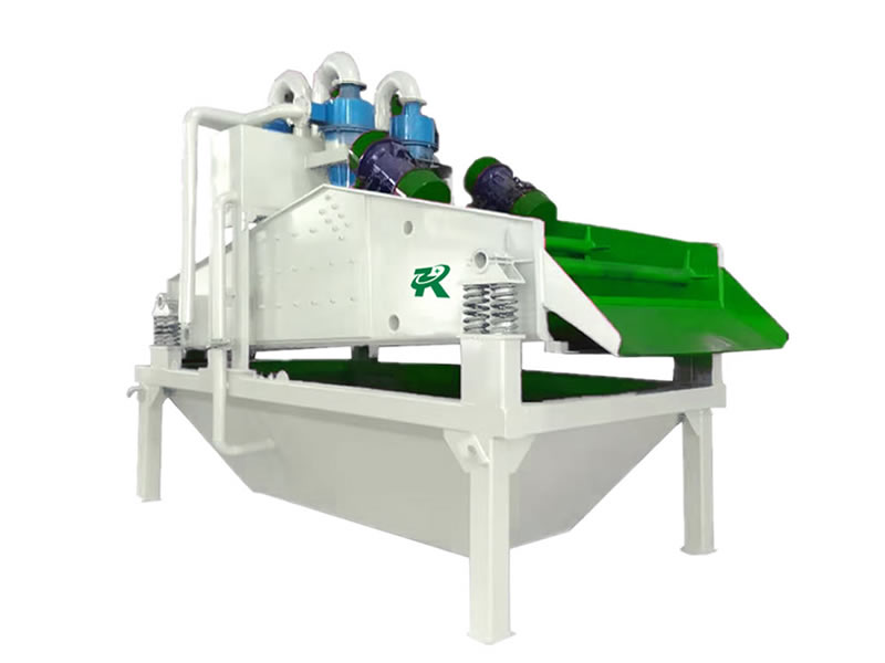 工作过程:泥浆水流入清洗槽,通过耐磨泵将泥浆水送入浓缩器,经过浓缩器把污水和砂分离,砂经喷头到脱水筛,脱水后送入输送带。污水回到反料箱,分流入清洗槽,多余部分外泄。