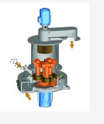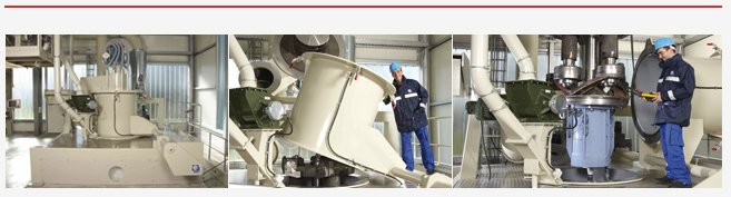 原料通过进料装置输送进入研磨机,并掉落到研磨机下磨腔的底部。位于每个磨辊前的铲刀在旋转时从底部铲起物料送至磨辊和磨环之间的位置,即物料研磨区。空气流将磨碎的物料从研磨机下磨腔带起进入研磨机顶部的静态或动态分级机。通过调节分级机可以控制物料产品所需粒径。被分离出来的粗颗粒物料落回到研磨机重新进行研磨。细粉则通过分级机被抽吸进入集尘器中。