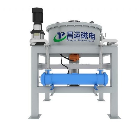 在螺旋紫铜线圈包围的工作腔内,放置装有一定数量的磁介质网。硅整流控制系统将工作交流电源转变为直流励磁电源。线圈通电后,磁介质网被磁化,其表面产生不均匀的磁场-高梯度磁场。被分选的物质通过工作腔的磁介质时,磁性物质受磁场力被吸附在磁介质上,非磁性物质从工作腔通过,从而达到将磁性物质和非磁性物质分离的目的。
