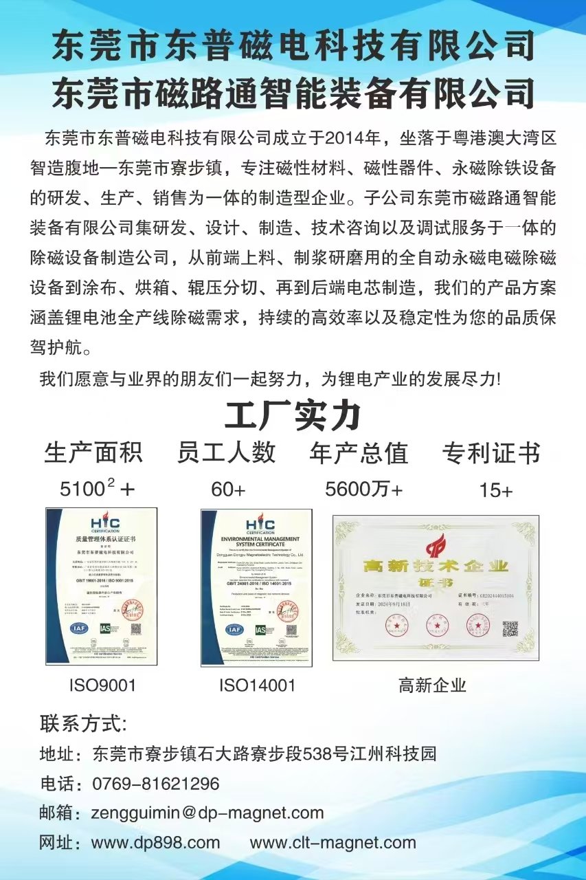 东莞市磁路通智能装备有限公司成立于2021年,公司由东莞市东普磁电科技有限公司控股,是一家集研发、设计、制造、技术咨询 以及调试服务于一体的除磁设备制造公司,业务聚焦新能源锂电、电池正负极材料、陶瓷、化工、食品、造纸、冶金等 全产线除磁设备的研发、生产、销售和服务。产品涵盖粉料旋转式除铁器、干式电磁除铁器、湿式电磁除磁机、永磁自动及手动式除磁机、管道除铁器等、 公司秉承精益求精服务至上、坚持以优质的产品、贴心的服务、良好的信誉口碑,成为客户值得信赖的合作伙伴。