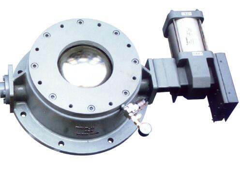 圆顶阀的主要结构组成圆顶阀主要由阀体、球顶、顶板、拐臂、限位开关、气缸等组成;在球顶两侧各置有一轴,球顶置放在这两轴之间,并由其两轴与轴承支撑,安装在阀体上,轴与球顶通过弹性圆柱销连接;一边轴的轴端设有轴端挡圈,轴与轴端挡圈通过弹性圆柱销连接;另一边轴的轴端设有拐臂,轴与拐臂通过弹性圆柱销连接;上支