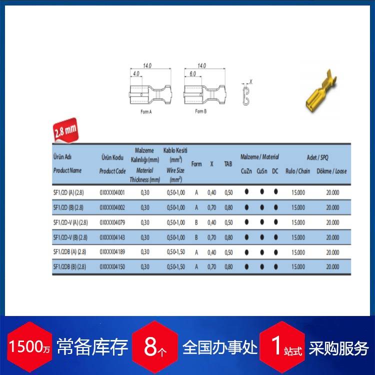 以SF1/2D系列(2.8mm)母端子为例,这是一款直插式连接元件,用于在电路板或对应连接器中建立可分离的电气连接。其材料厚度通常为0.30mm,适用线径范围为0.5至1.5 mm²,可选用黄铜(CuZn)或磷青铜(CuSn)基材,表面提供锡(Sn)、镍(Ni)、银(Ag)等多种镀层选择。产品通常以卷带或散装形式提供。