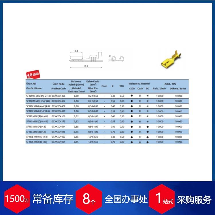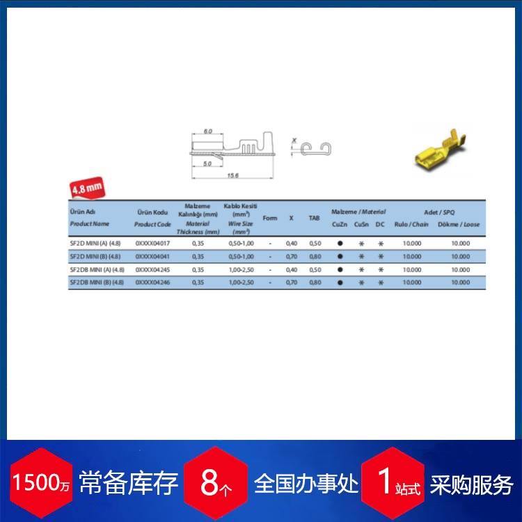 该品牌产品的特点体现在几个方面:一是产品系列化程度高,从2.8mm到6.3mm多种间距规格齐全,能匹配不同电流和空间要求;二是提供多种材料和镀层选项,如CuSn材料具有较好的弹性,可满足反复插拔的需求;三是与自家生产的多种型号绝缘外壳(如R型、TS型等)完全匹配,确保了连接的可靠性和系统的兼容性。