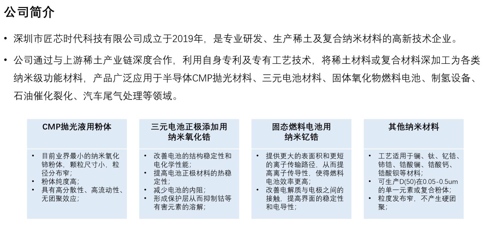 产品广泛应用于半导体CMP抛光材料、三元电池材料、固体氧化物燃料电池、制氢设备、石油催化裂化、汽车尾气处理等领域。